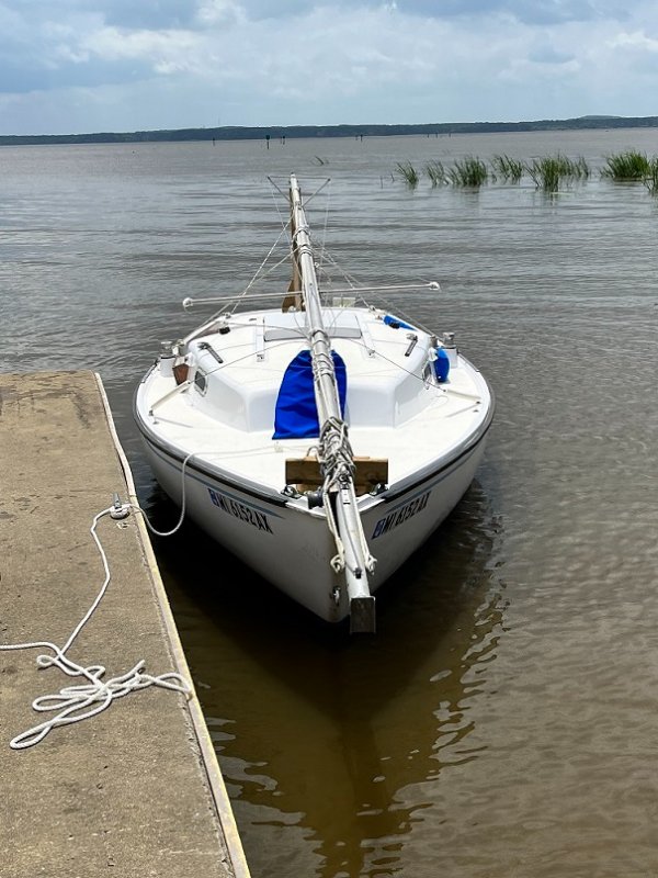 Here is a picture of the jib I sewed hoisted while the boat was on the trailer. IMG_4421.JPG I then dropped the mast using the A-frame with a block and tackle. IMG_4433.JPG This picture shows the mast down resting in the aft mast crutch. IMG_4434.JPG And finally the mast is moved forward and tied do...