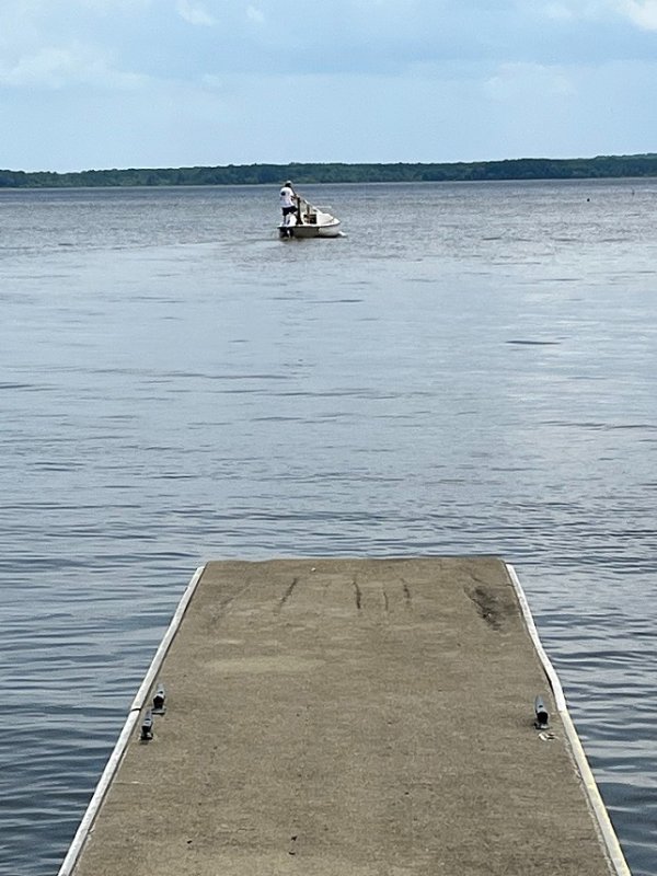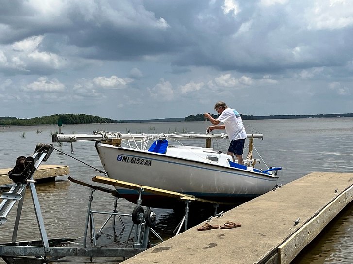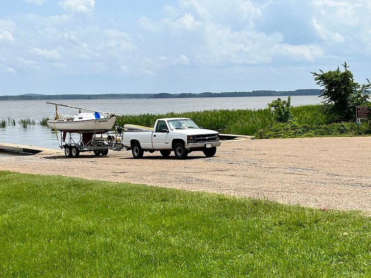 Then it was off to the boat ramp. Here the trailer is blocked and unhooked from the truck. I am untying the extension tubes. I had decided not to raise the mast. I just wanted to make sure I could get the boat off then back on to the trailer. IMG_4442.JPG The extension tubes hooked up and ready for ...