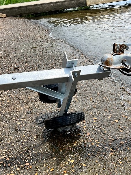 This is where I had a problem. Notice the brackets of the dolly. They are leaning over. IMG_7949.jpg I went ahead and continued to back the trailer in with the dolly leaning over. Second problem. The trailer tires are about at the end of the concrete ramp and I needed a little more to float it off. ...
