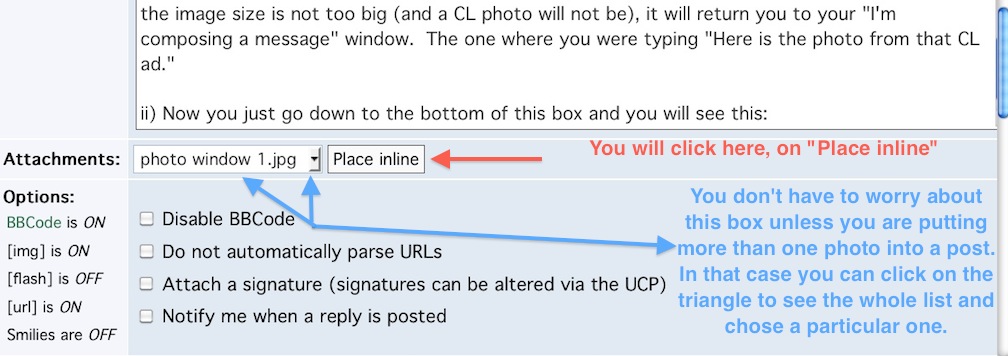 i) You open up a reply window, just like you do to make any reply to a thread. Type whatever you want in, such as "Here is that photo from the CL posting" and then scroll down below the text box by a few inches. You will see this: Once you click on "Browse..." you will get the usual window you have on your computer when you are looking for files. I can't remember what it is called on Windows, but I think you will recognize it as something you use pretty often. You will navigate in your actual computer through this window and find the file you just saved in Step 1. For me this was "Sunset beach boat.jpg" in my "Desktop" area. Once you find it, click on it to select it and then click "Open" or whatever your usual default button is at the lower right of your window that means "Yup, do this." I would post a screen shot here, but if you are on Windows it won't look exactly the same. Once you do that, there will automatically be a string of words and slashes in that white blank area to the left of "Browse..."