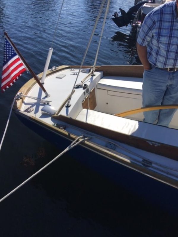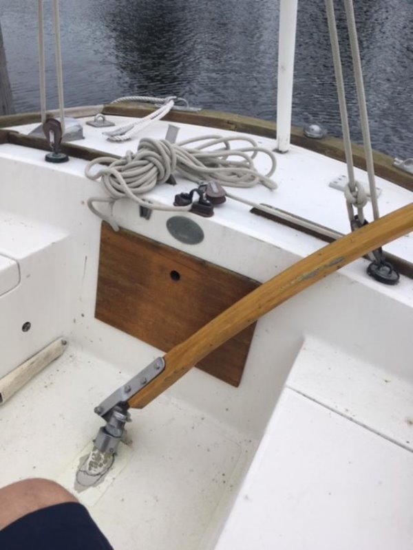 Thanks for posting the photos. That's a good idea to have the metal bracket to protect the throttle. I recall when I still had an inboard engine that my crew frequently knocked the throttle out of position when moving around the cockpit. Now maybe that gear shift could be upgraded but at least the massive bronze handle makes a good fish club or anti-pirate weapon. Also, looks like a previous owner capped the original fiberglass toe rail and taffrail with teak which is a nice touch.