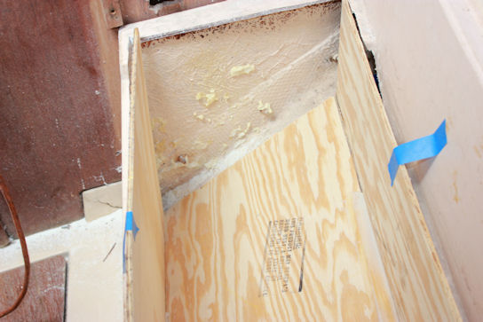Originally the hullsides in the v-berth were just painted fiberglass. The cleats are 1/2" ply, kerfed on the outboard side and set in thickened epoxy (the paint was ground off in preparation). The insulation is 1/2" polyisocyanurate, friction fit.