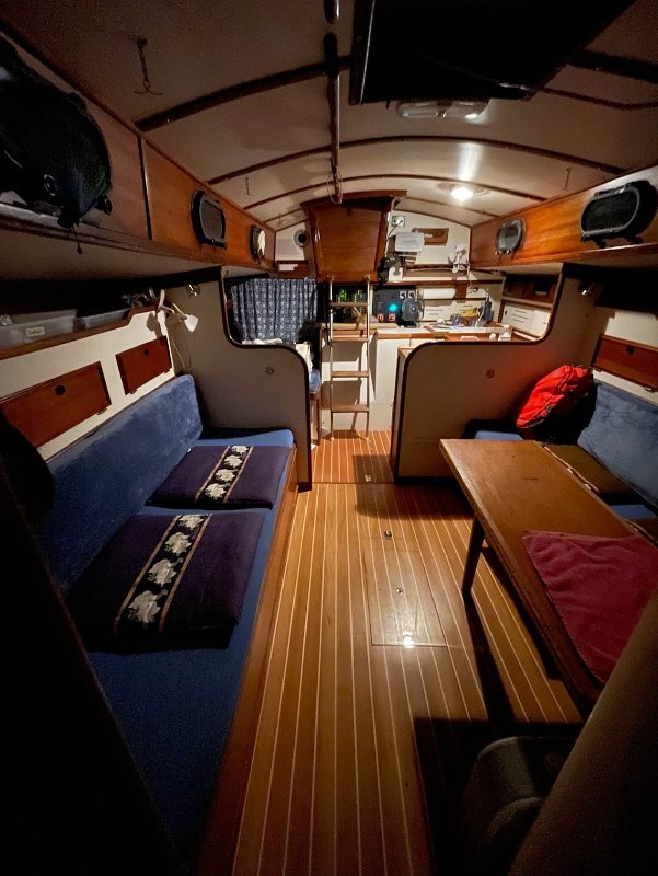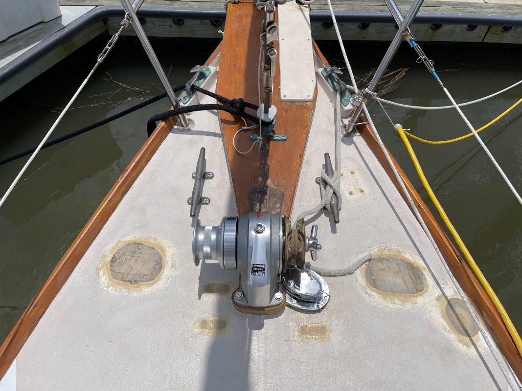 Work still remaining includes replacement of the standing rigging; replacement of the sails; design and construction of a new battery compartment to accommodate the house battery and two 48v lithium ion batteries for the electric outboard; redo of all the electrical wiring; installation of a Monitor wind vane and a Raymarine autopilot; installation of solar panels and supporting arch over the cockpit; installation of a marine compost head; and installation of manual pumps for galley and head sinks.