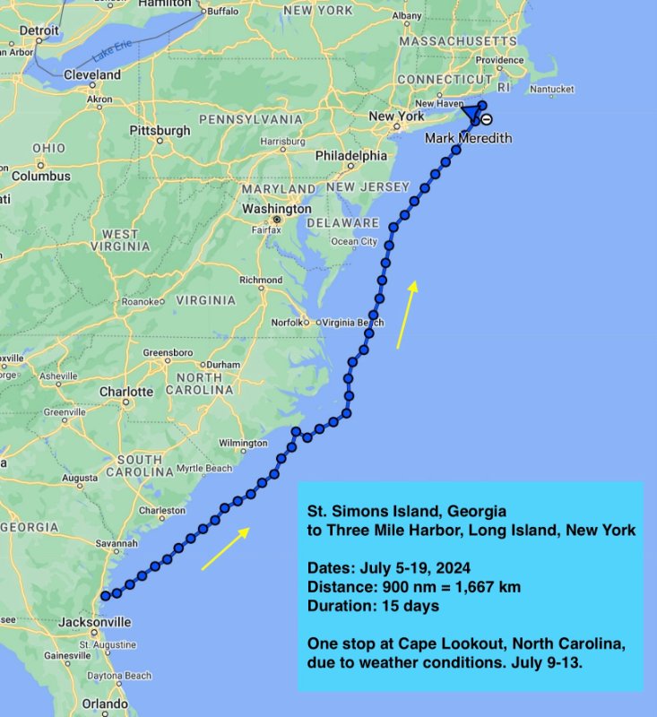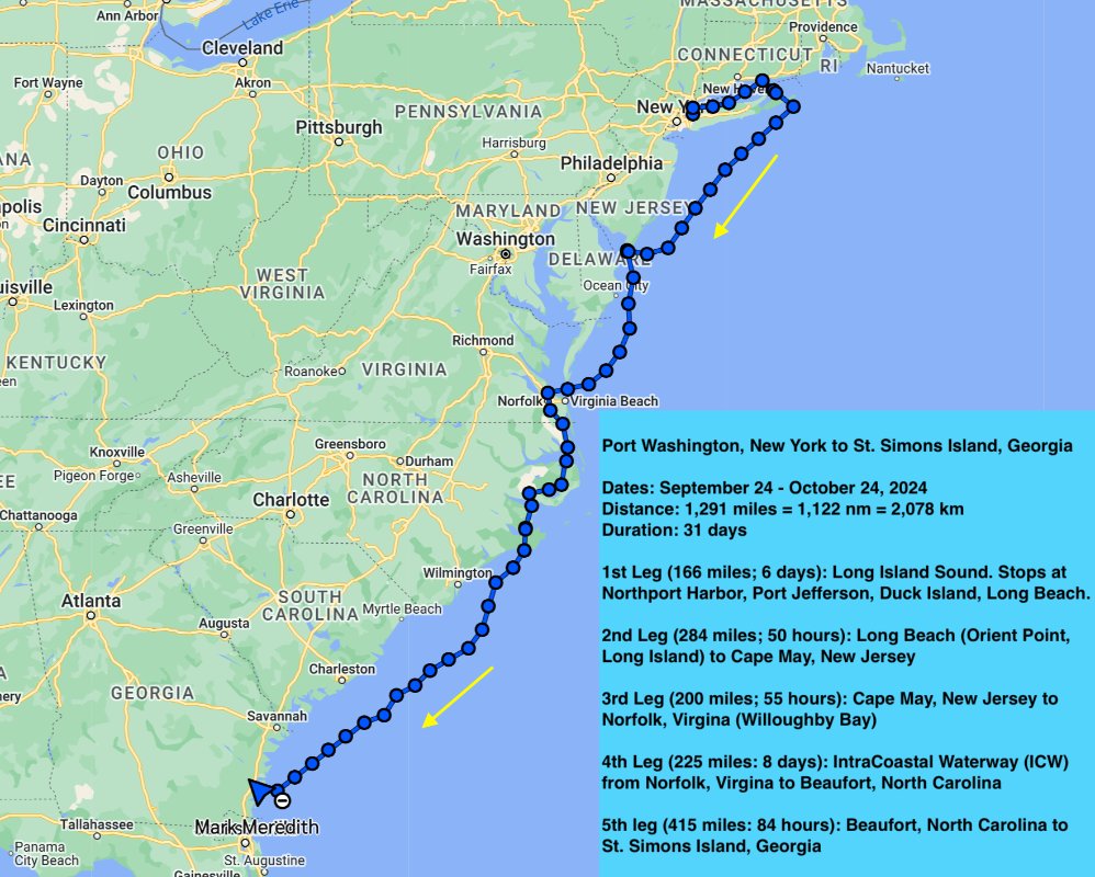The second voyage was another circuit from St. Simons Island, this time up the East Coast to Long Island Sound and back. The whole trip was about four months. I cast off on July 5th and dropped the hook again off St. Simons as the sun set on October 24th. Instead of going through New York City and up the East River, I stayed on the outside, continuing on to the end of Long Island and then rounding Point Montauk into the Sound. The trip up took one month, including a single stop at Cape Lookout to let some weather pass and a series of day sails to work my way up Long Island Sound once I made it around Point Montauk. The longest leg was the six-day trip from Cape Lookout to Three-Mile Harbor, my first anchorage on Long Island. Ultimately, I made my home base at the anchorage in Port Washington, which offered a charming sailor-friendly town and a short hop to New York City on public transit.