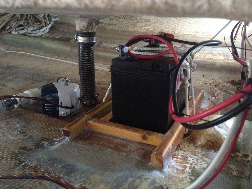 I built up a wood base for a battery. I got it all coated with epoxy. This is where I am going to put the battery. Just aft of the V-berth bulkhead. I set the base in with thickened epoxy and tabbed over both ends. I bought a small battery then made some cleats to hold it in place. I got them coated with epoxy. The plywood board, in the picture, is for a opening in the V-berth. Then epoxied the cleats in place and put the battery in. I also got it wired up. Here is the opening in the V-berth. More to come.