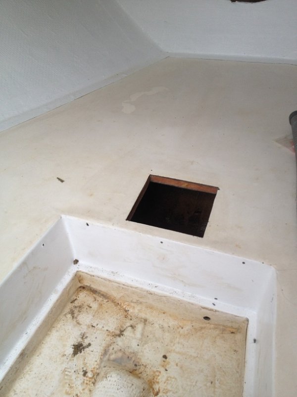 Here is the cleat epoxied in the hole in the V-berth and painted.