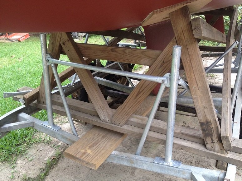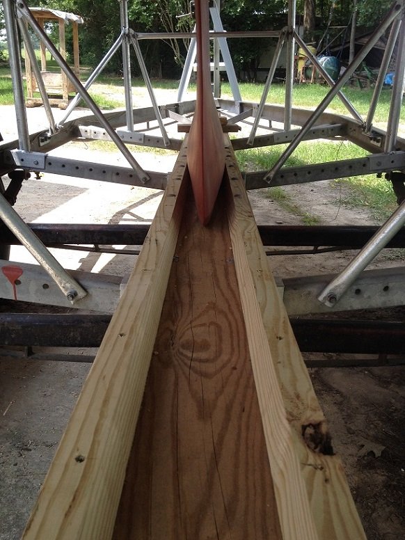 With most of the uprights in with threaded rods, I was then able to take apart the wood cradle and get it out of the way. With blocks on the top I tightened up the nuts to lift the boat up off the wood cradle. I was then able to finish getting the uprights bolted on with all the braces.