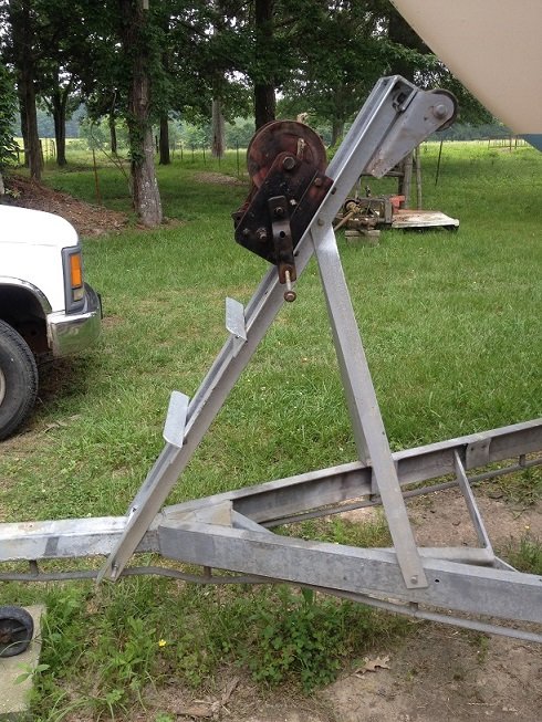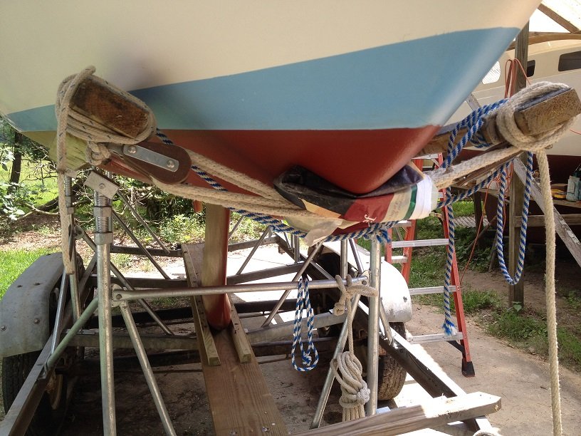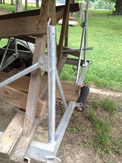 Here the trailer is blocked and unhooked from the truck. I am untying the extension tubes. I had decided not to raise the mast. I just wanted to make sure I could get the boat off then back on to the trailer. The extension tubes hooked up and ready for launch. Next time - problem with launching.
