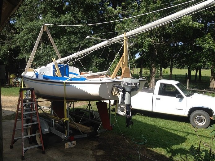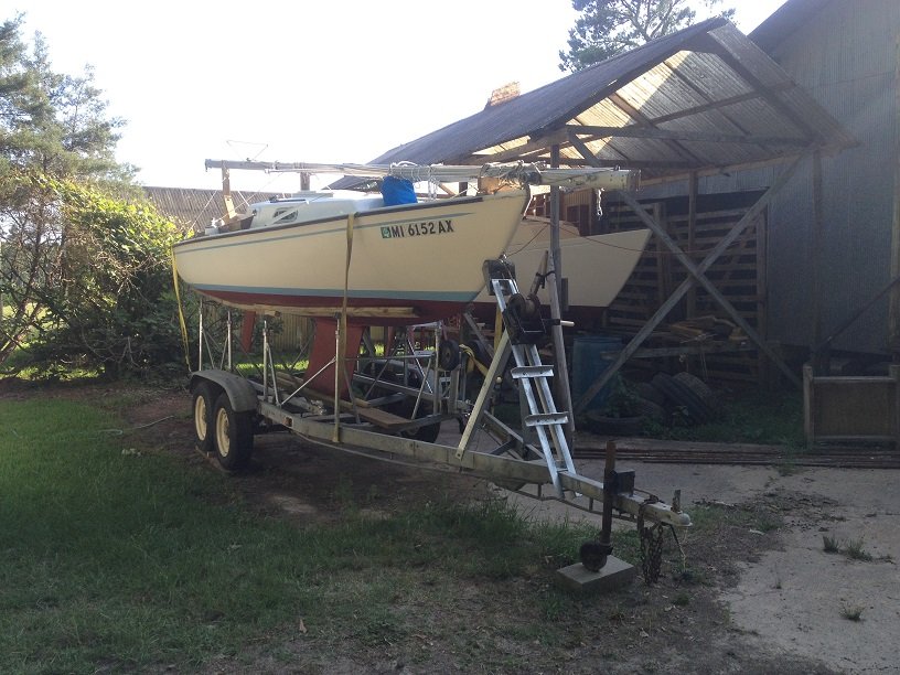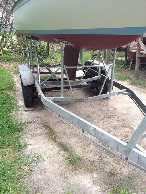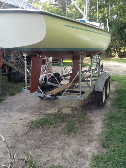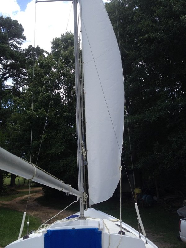 Here is a picture of the jib I sewed hoisted while the boat was on the trailer.