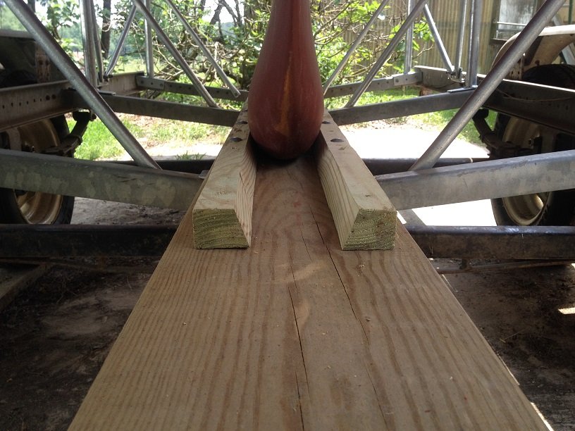 I then slid the keel board back into place, bolting the brackets on as it went in. Then I bolted the brackets to the trailer. I then ripped a 2 x 4 and bolted/screwed them into place as side boards for the keel. I set the boat back down on the keel board.