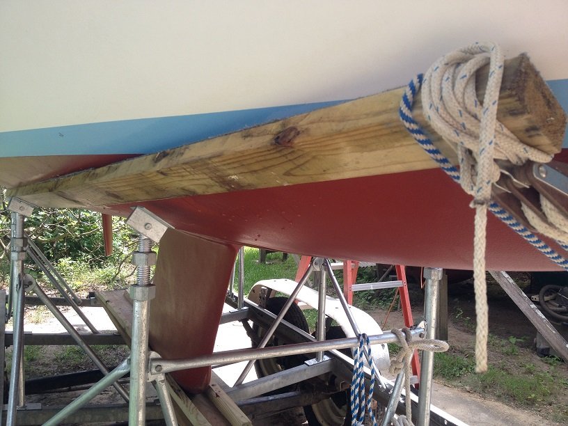 I put together some blocks, for the front, and two crutches for the back. One on the aft end and one that will stand in the front of the cockpit. Also built a a-frame for a pivot at the mast to run the fore stay over pulling the mast up. No pictures. Then I got the mast raised.