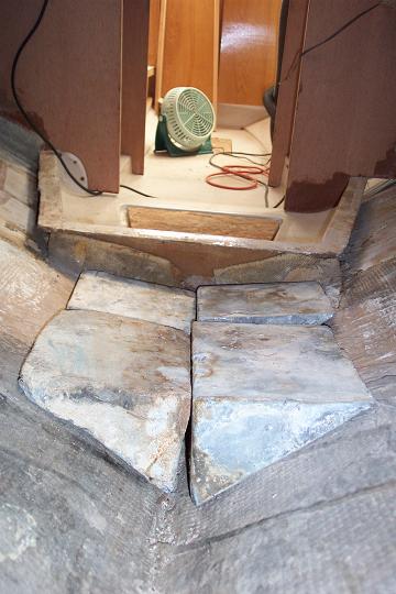 The floor pan is made in two pieces. The main cabin area is one and the v-berth/head area is another. They come together at the 1/2" bulkhead between the main cabin and the head area. They are not joined together in any way with a 1/8" to 1/4" space between them. Underneath there is nothing holding them up.