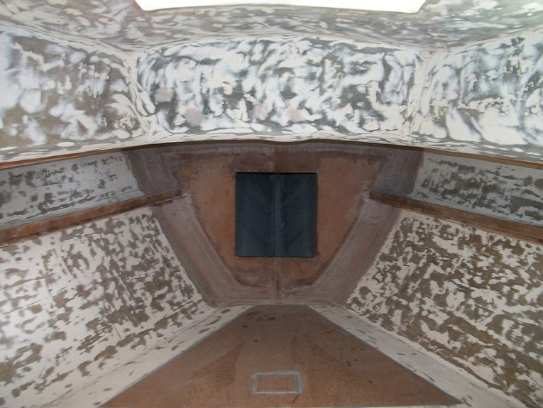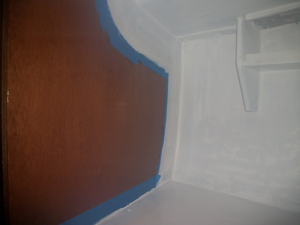 The ceiling in the hanging locker was just the hull heavy roving no light weight cloth. I just sanded the high spots of the roving not worrying with the low. It didn't have the same two coats of paint and the paint was still sticking just fine. Also I was not worrying about any print thru in the hanging locker area.