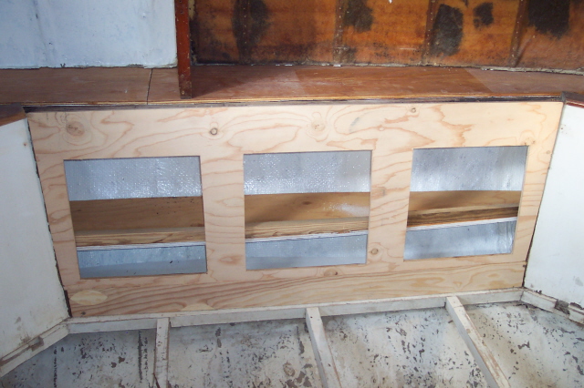 Just got back from a full day on the boat. The first few hours were spent sanding the hull. Boring but it is finally coming to an end. One more coat of filler, hopefully the last. Then I sanded parts of the interior. The old varnish is tuff to get off but i am making progress. Then I worked on some fun stuff! I have been working on the electrical system. Here is a picture of the busbar panels I only have three of the six busbars attached. The two on the left go to the AC system while the ones to the right will be the DC groups. When finished the whole area will be painted white for better visibility. I have followed the advice given on this web site and have added a 3/4 picture frame to mount the actual panel on. This gives me more clearance and should make for a neater installation. This shows a box I am thinking of adding to accomodate a VHF and Good times radio. It will have a red LED light underneath it for nighttime visbility. Probally put some powerpoints there also I am not committed to it yet, but I think I like it. Finally I finished putting the cabin liner on the port side side, varnished some of the trim pieces and installed them. What do you think?