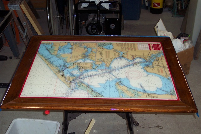More Sanding on the old boat but we are making progress. I have built out areas for my chainplates on the hull. The old chainplates were through the deck and very weak. I have moved the two rear chainplates on each side to the hull. In order to get them to contour to the hull I had to build out some raised areas. No pictures of that yet, maybe next week. I do have pictures of a couple of small projects I have been working on at the house. The first is the lid to my navigation table. I repaced the rotting top and instead of using formica, (thats what it had before) I decided to laminate the chart for Galveston Bay onto it. When I was rebuilding the top it was discovered nothing was square. Seeing I did not want to rebuild the cabinet I went back with what I had. You can see a little of the crookedness if you look close. I also have been working on the bowrail. Its rough but I hope to have it all welded and polished soon. I have also just purchased several hundred dollars worth of hoses and wires. i hope to have the engine install complete in a couple of weeks.