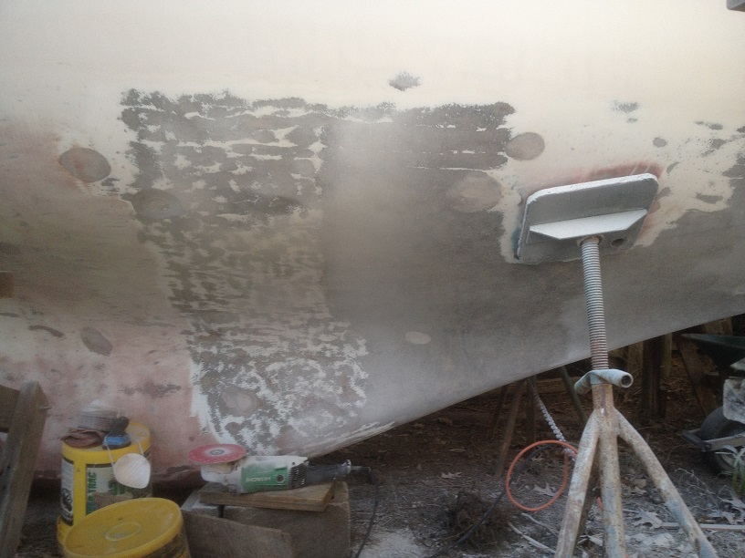 And the big news is that I got through sanding off the gel coat off the port side bottom.