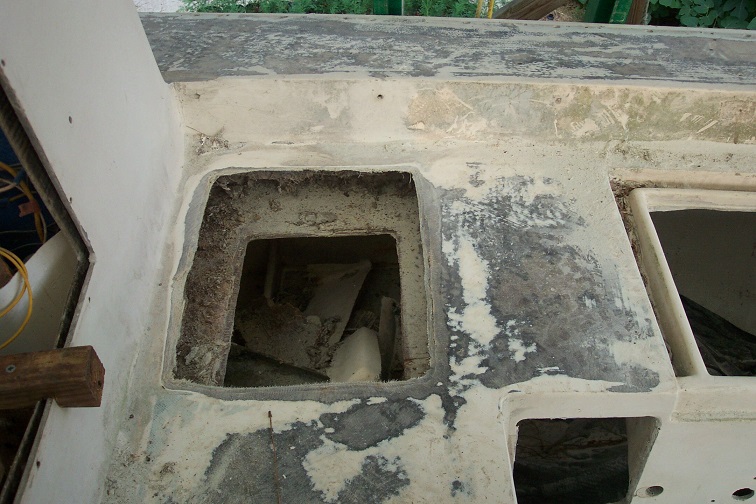 It's been a little while since any work has been done, but the summer heat is easing a smidge and I've started back. I got the old 1 1/2" seacock/thru-hull for the sink drain cut out. I beveled out the sink drain hole and the hole for the old 3/4" water intake on the other side. Epoxyed on four layers of biaxel on the out side of the hull on both holes today.